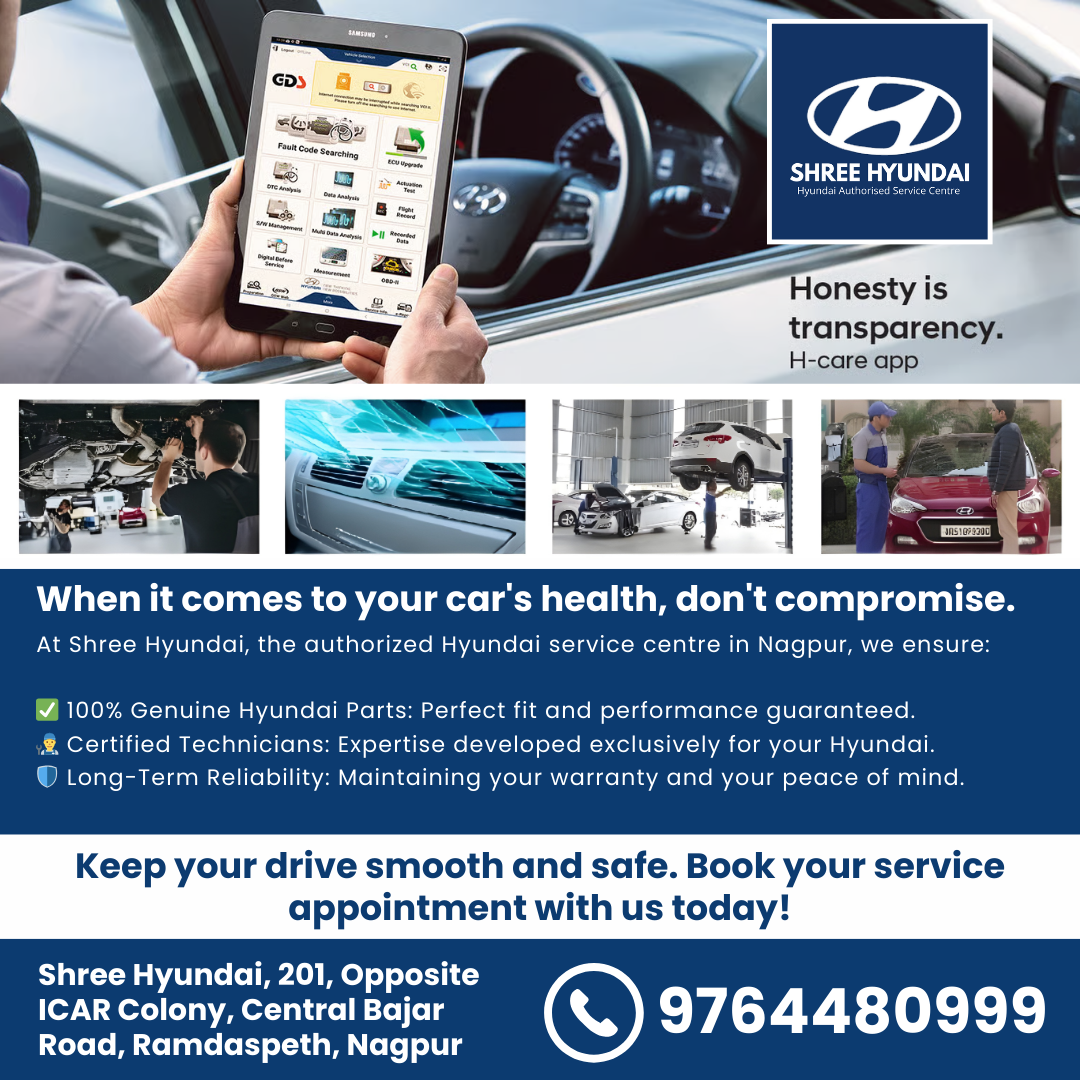 Regular full servicing helps improve mileage, prevents unexpected breakdowns, and extends your carβs life. π§ Book your service at Shree Hyundai Service β Authorised Hyundai Service Centre, Ramdaspeth, Nagpur β Genuine Hyundai spare parts β Expert technicians for all Hyundai models β Quick, reliable & trusted service π Central Bazar Road, Ramdaspeth, Nagpur β 440010 π Call: 97644 80999
